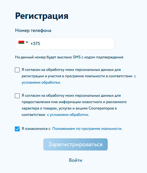 Укажите номер вашего мобильного, который будет привязан к вашему персональному счету. На него будет выслано SMS с кодом подтверждения. Также отметьте галочками пункты согласия на обработку персональных данных.
